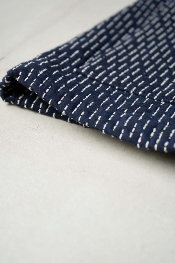 前端から裁ち続きの襟にかけて、生地の地の目を合わせることで、刺し子織りの表情が生きています。