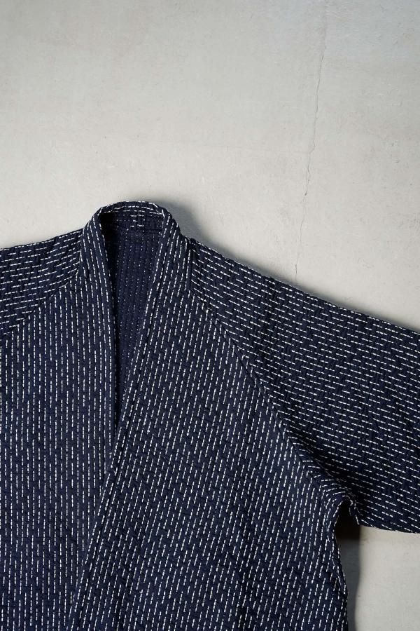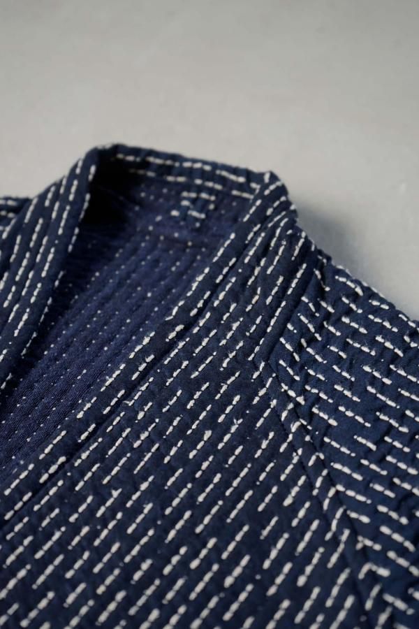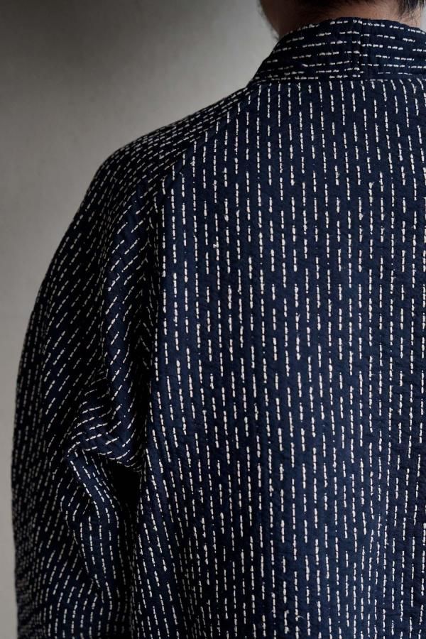 生地全体にあしらわれた絹紡紬糸を使った刺し子が印象的なデザインで、身幅や袖幅は大きく設定しゆとりをもたせたパターンに。