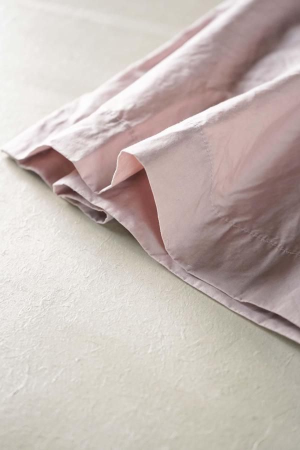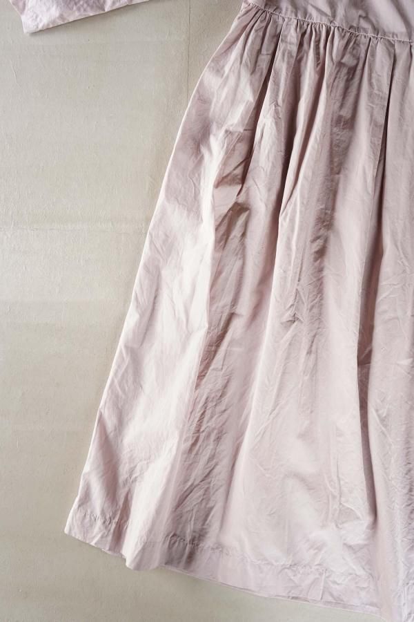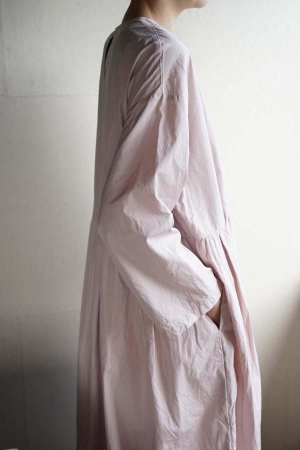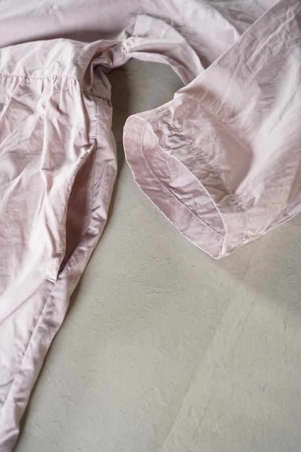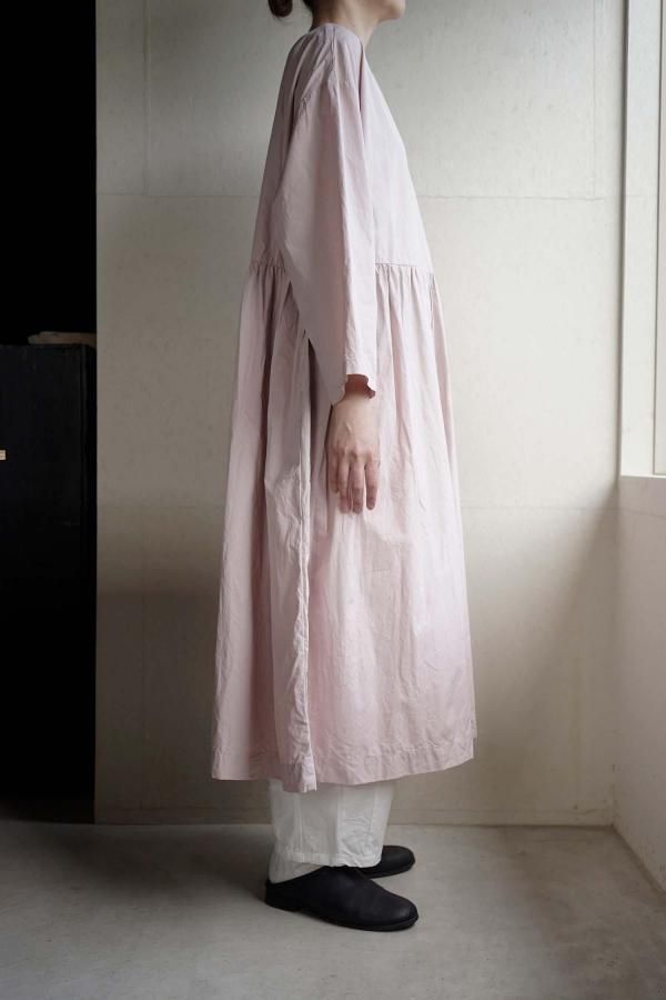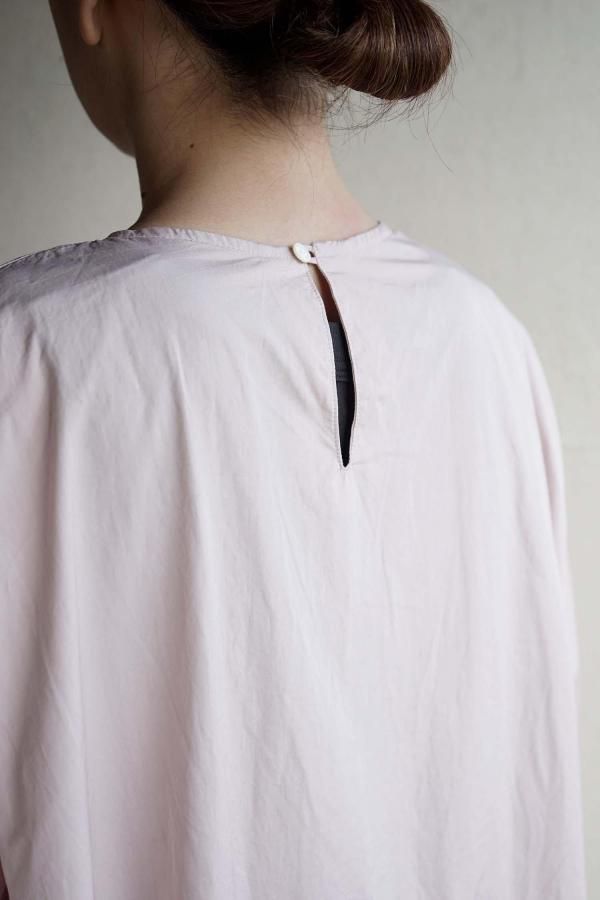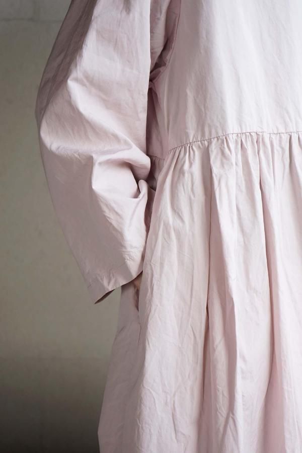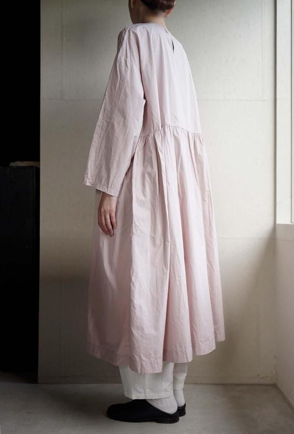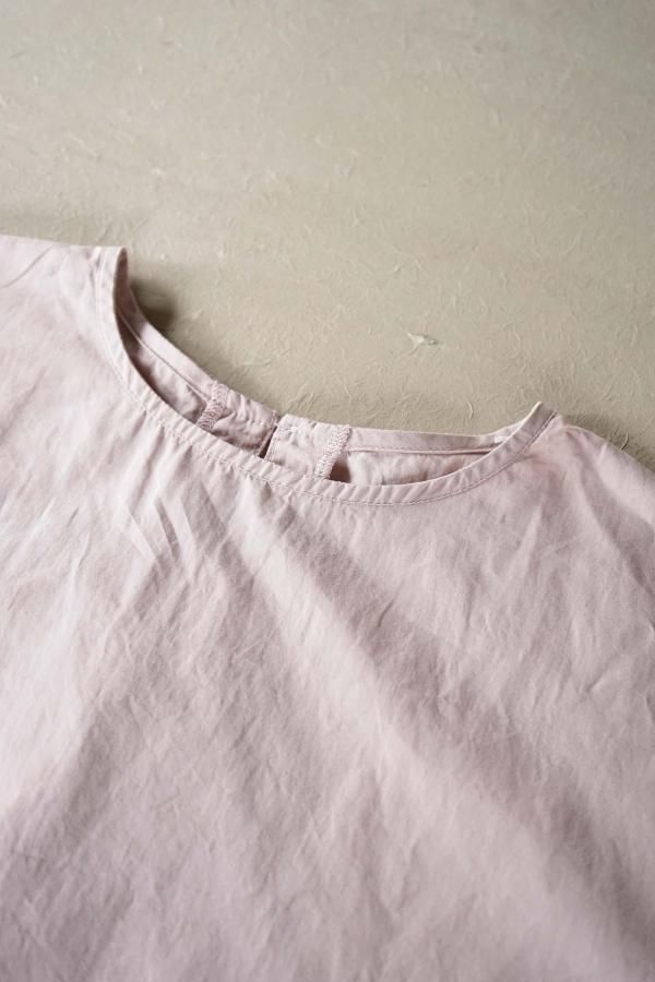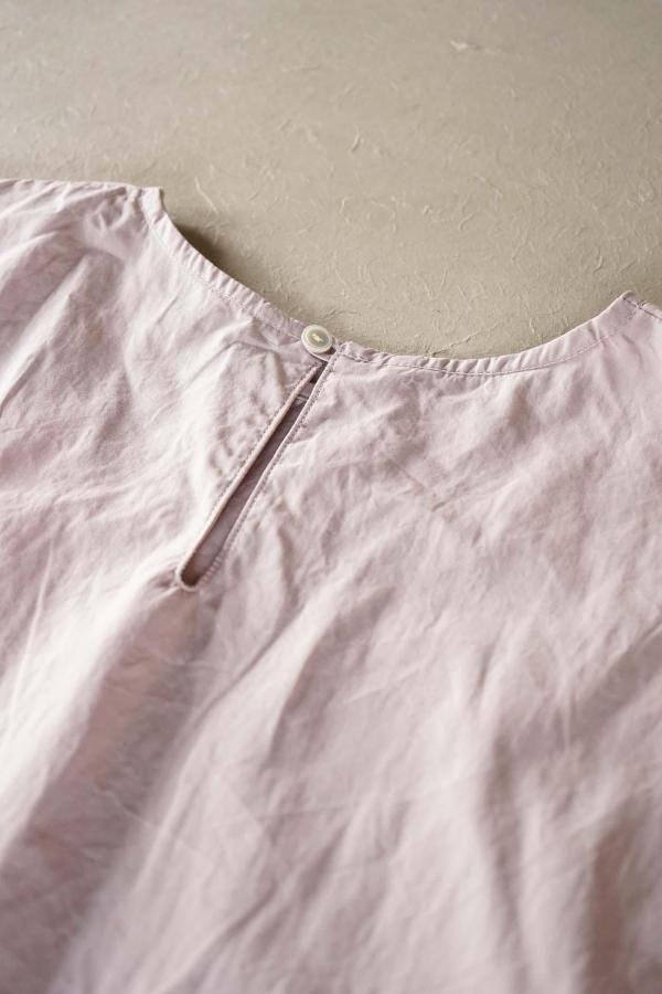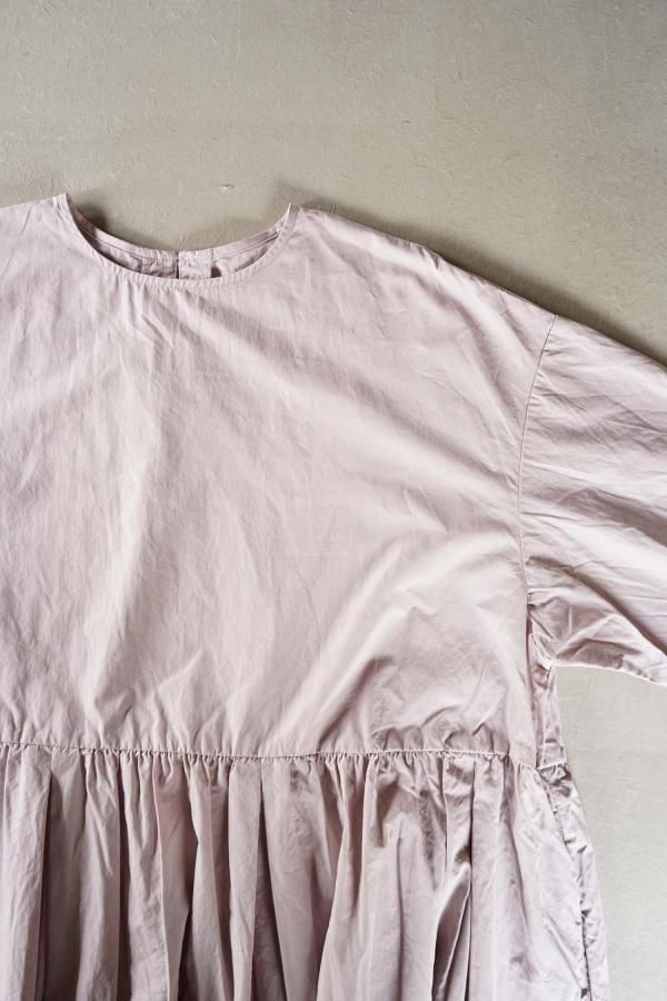 ウエストからたっぷりとギャザーを入れ、首元は後ろ開きのすっきりとしたクルーネックのデザイン。