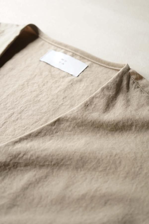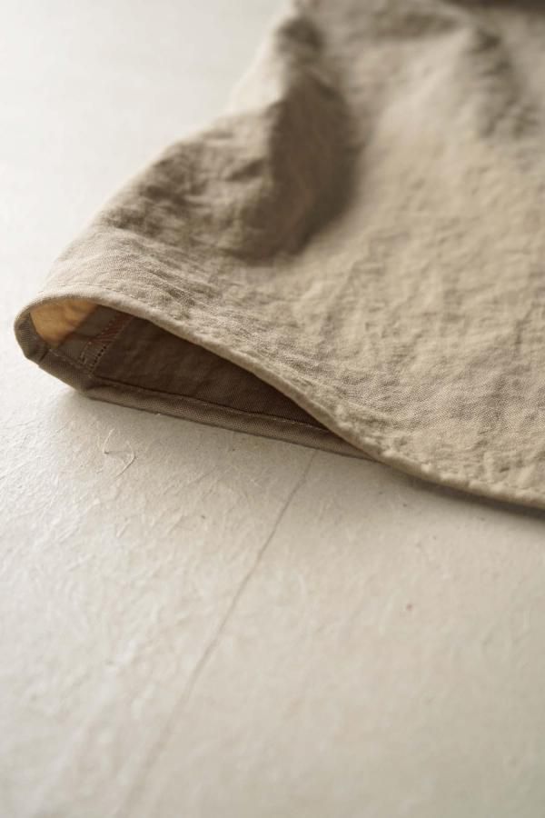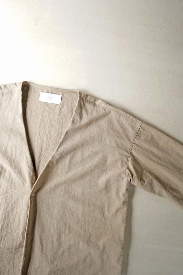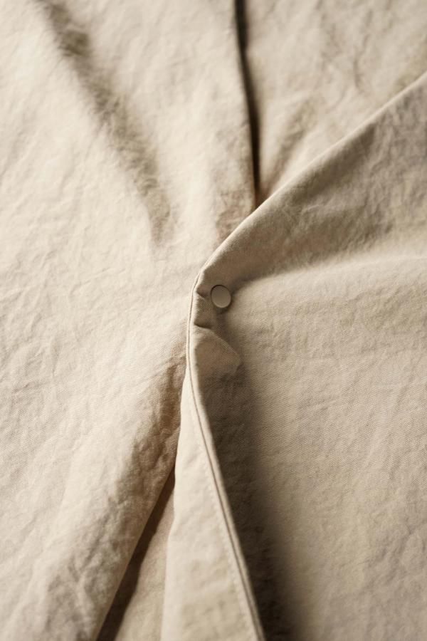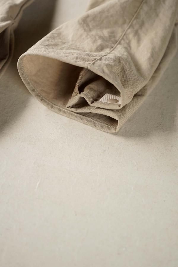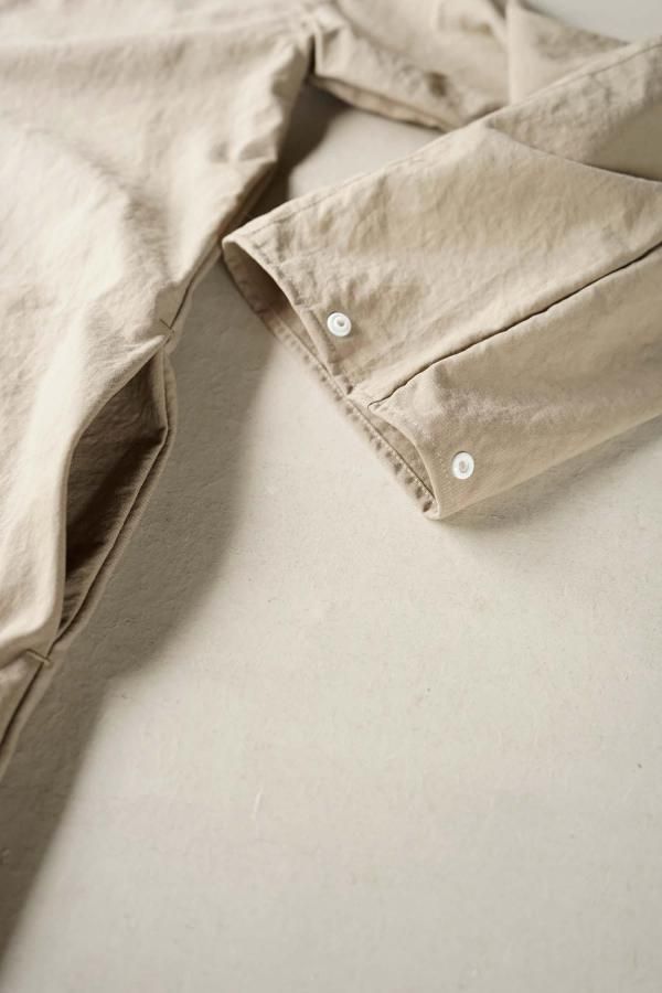 最低限の必要なステッチのみで縫製した一枚仕立てのシンプルなデザインで、袖口はスナップボタンによってシルエットを変化させることも。