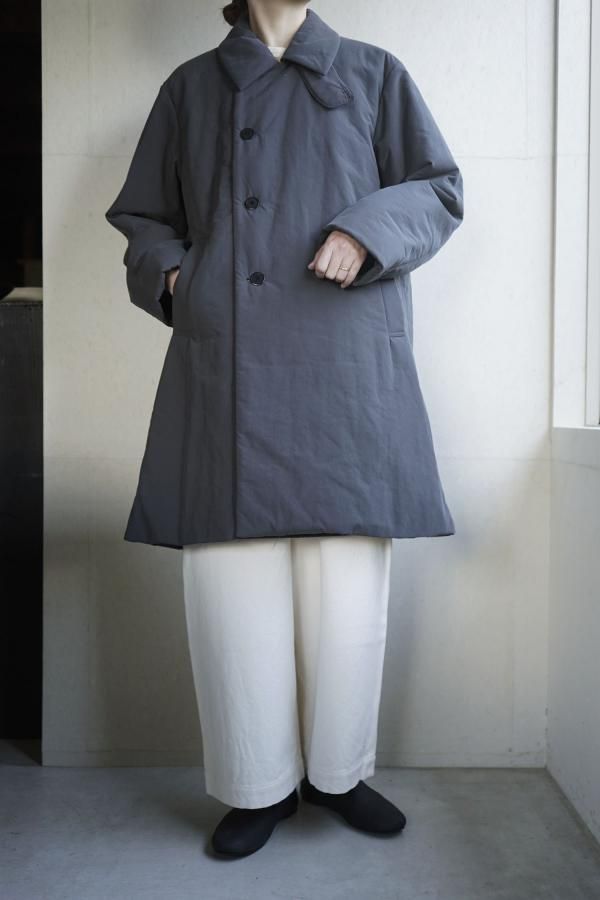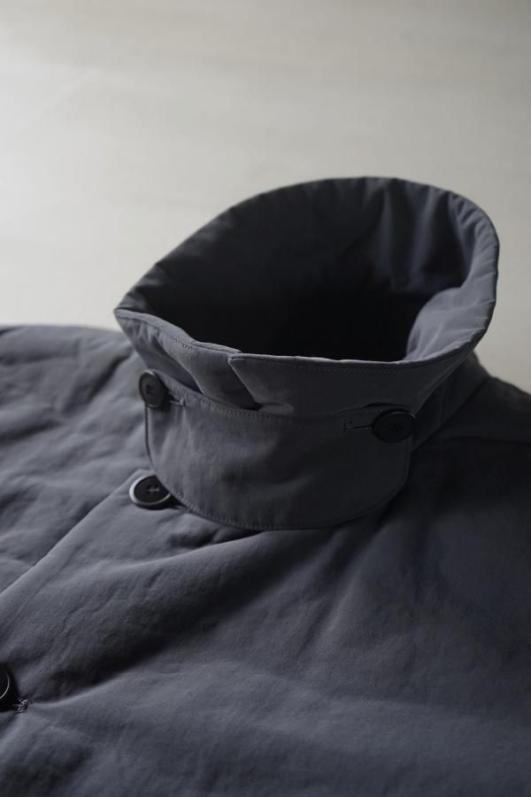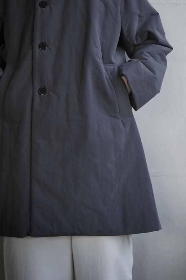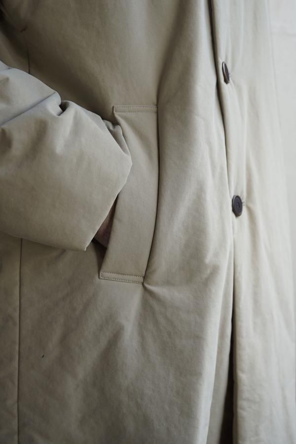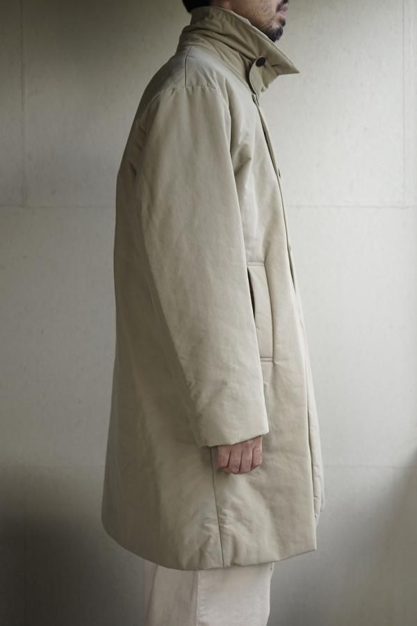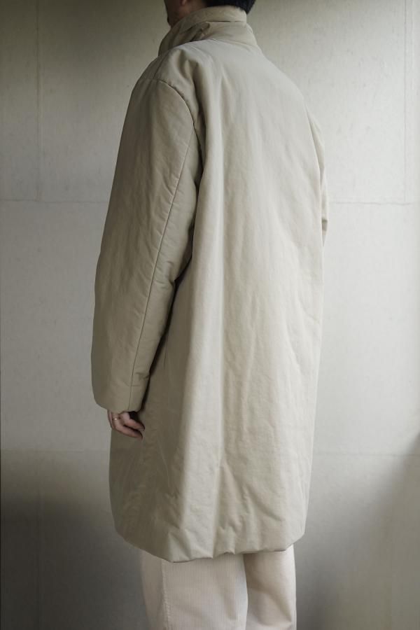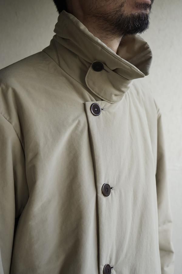 ナイロン生地に高機能中綿を加工した、とても軽量なステンカラーコート。