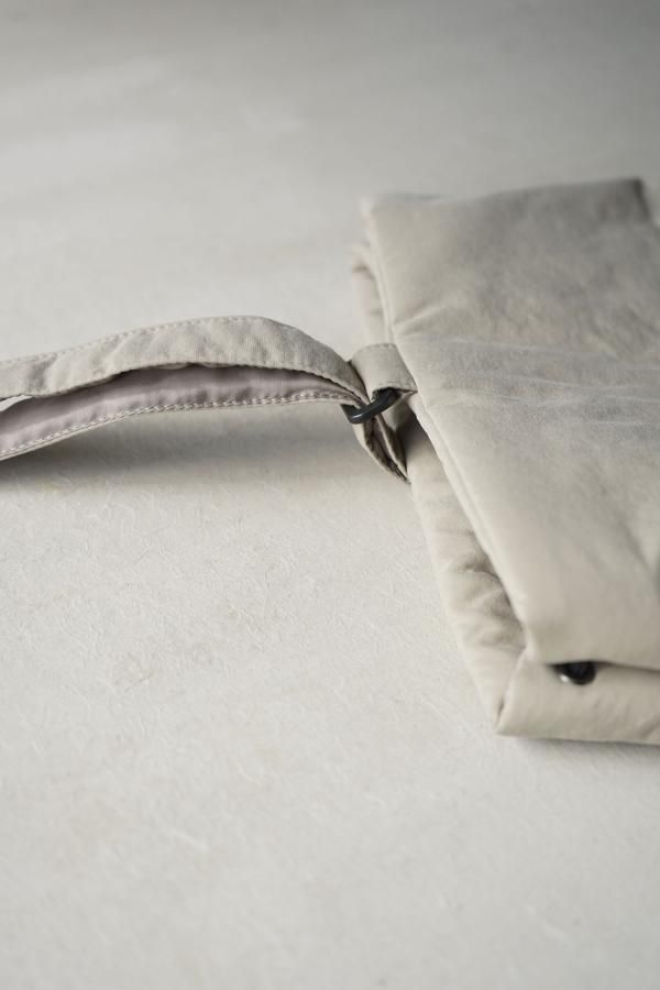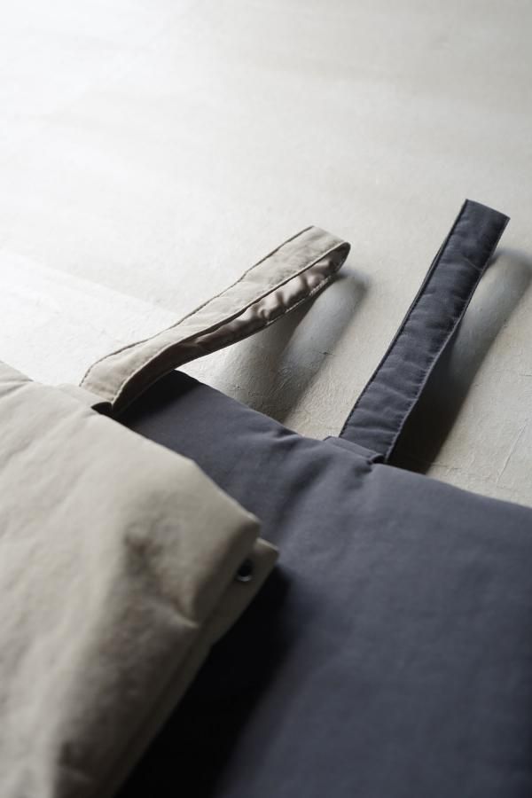 表地は撥水性のあるナイロン生地を使用し、中綿の入ったふっくらとしたフォルムが印象的です。