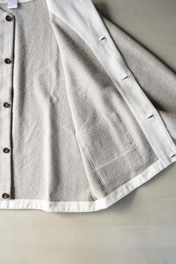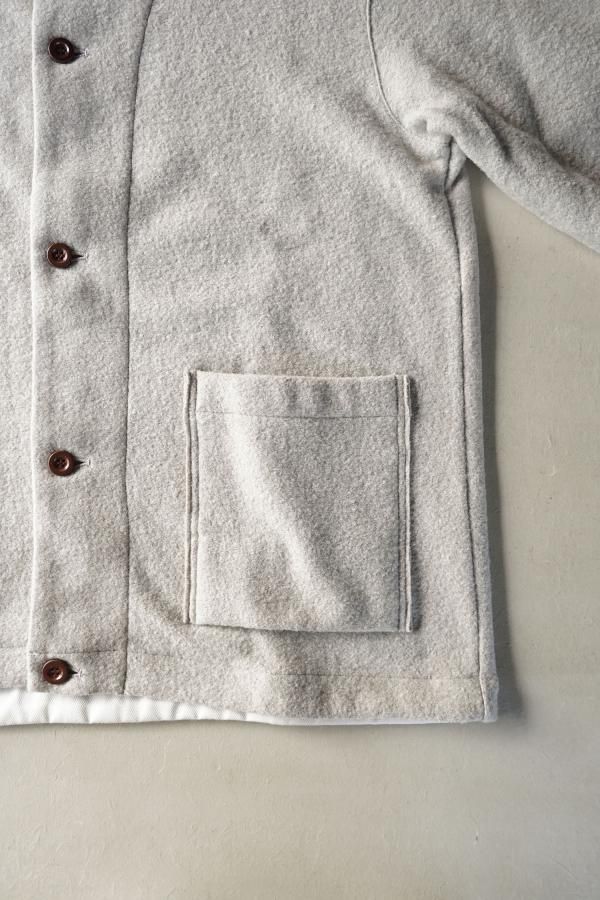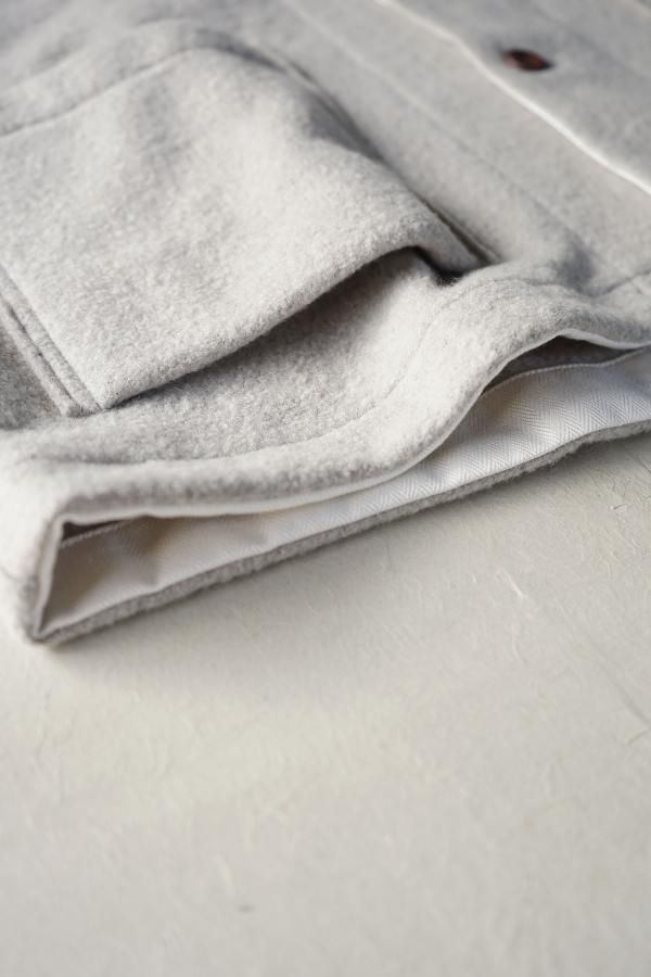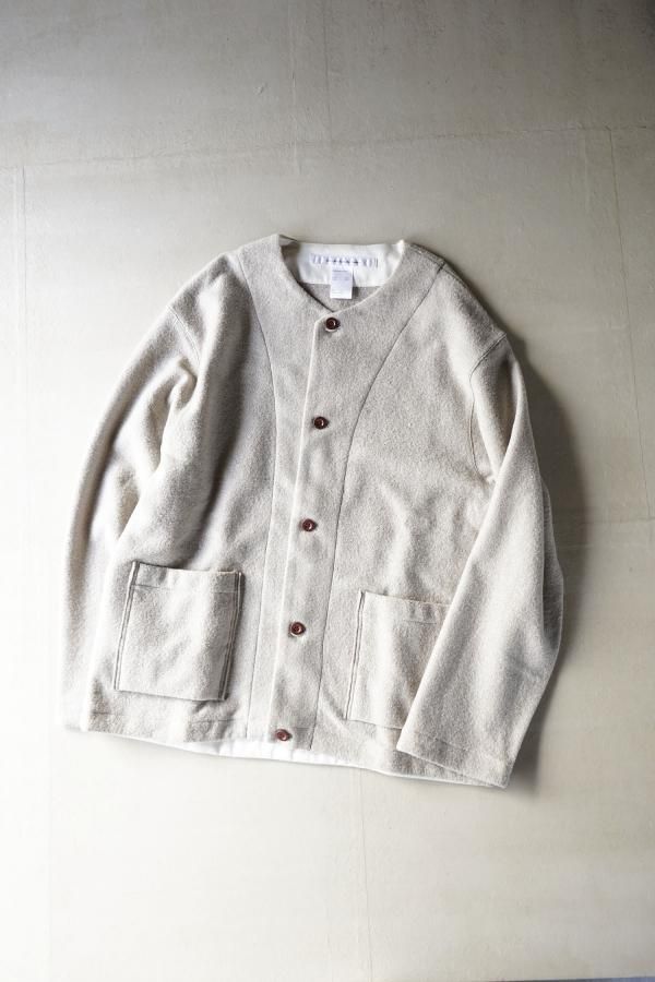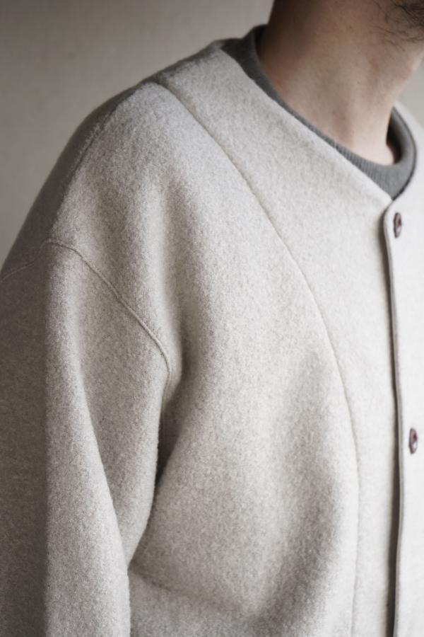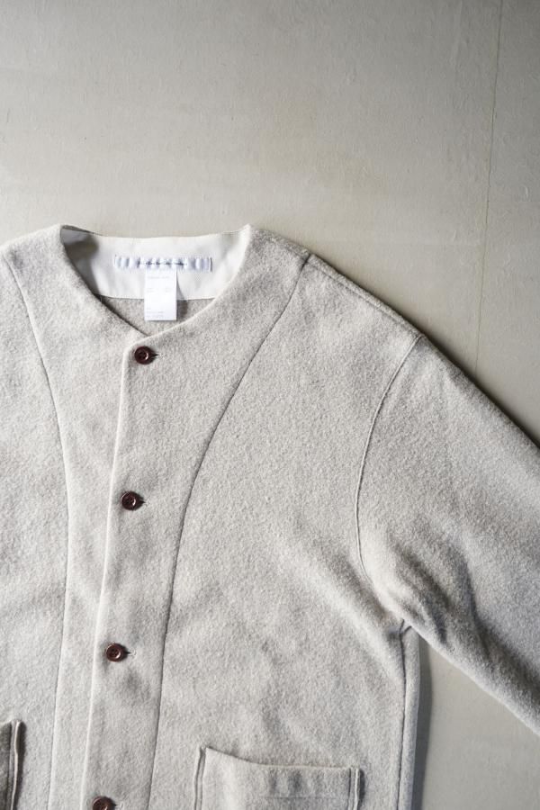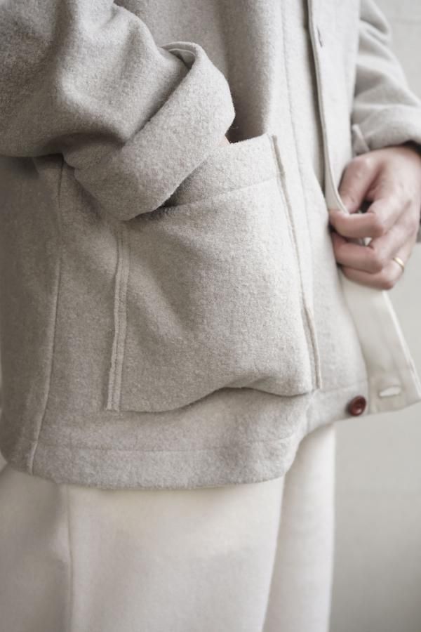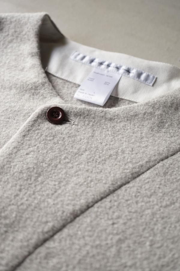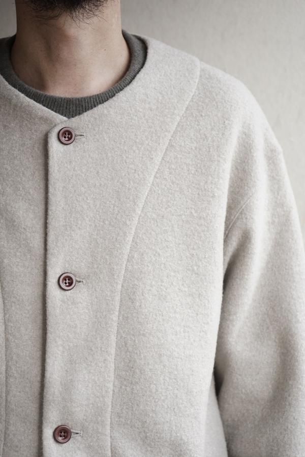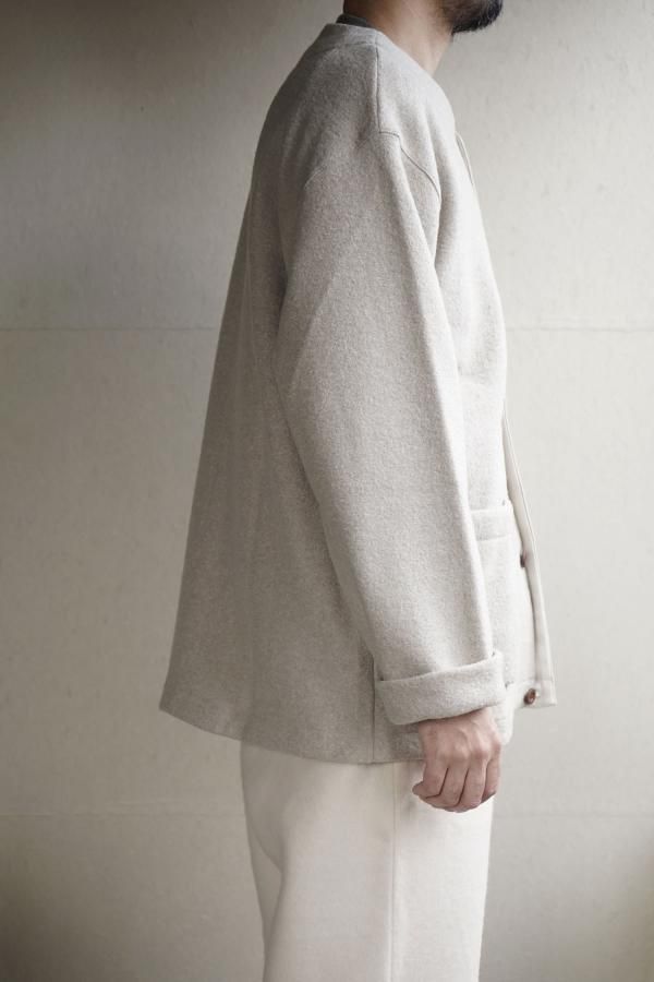 ノーカラージャケットとカーディガンの中間のような位置づけで、襟裏や袖口裏などにはヘリンボーン生地を合わせ、裏地無しでもしっかりとした表情に仕上がっています。