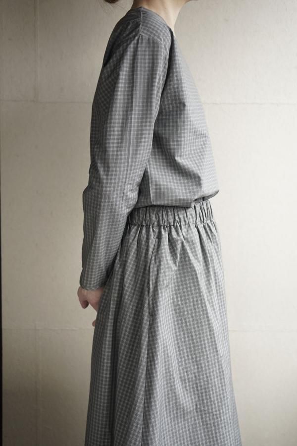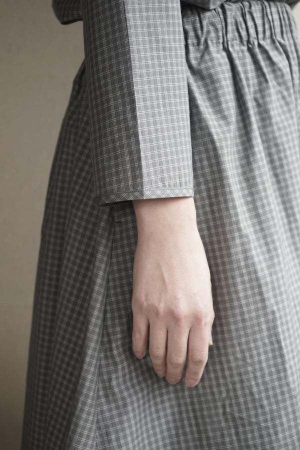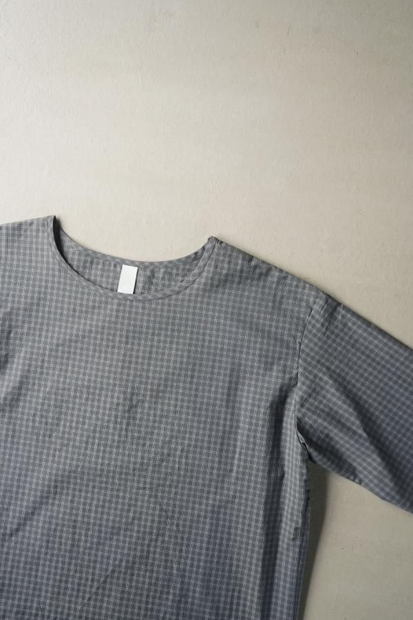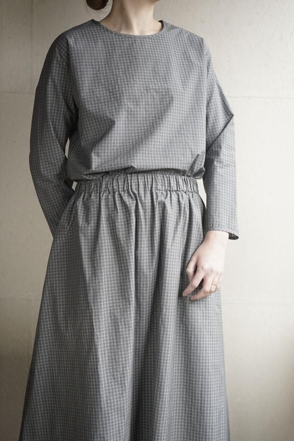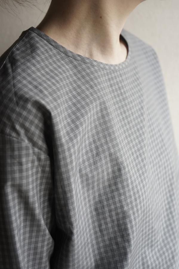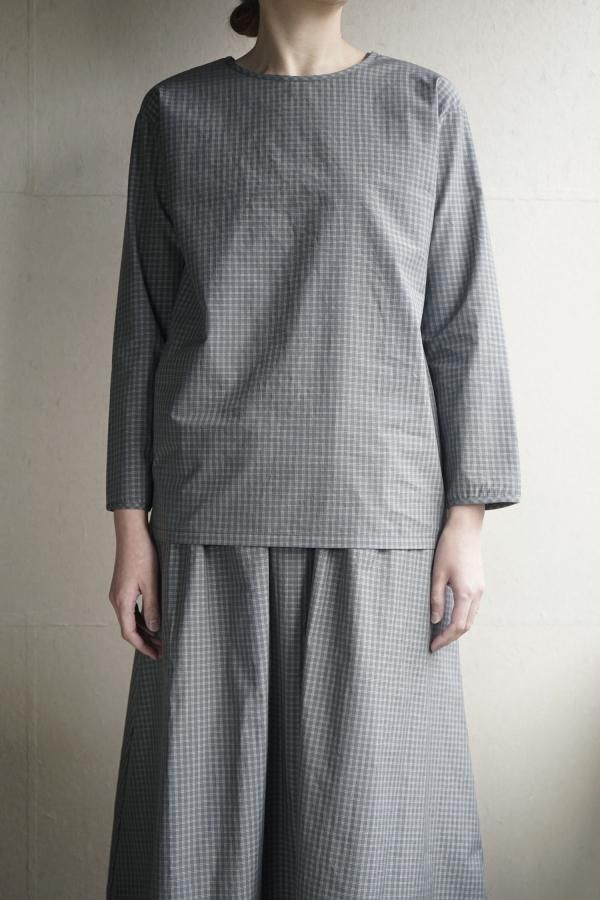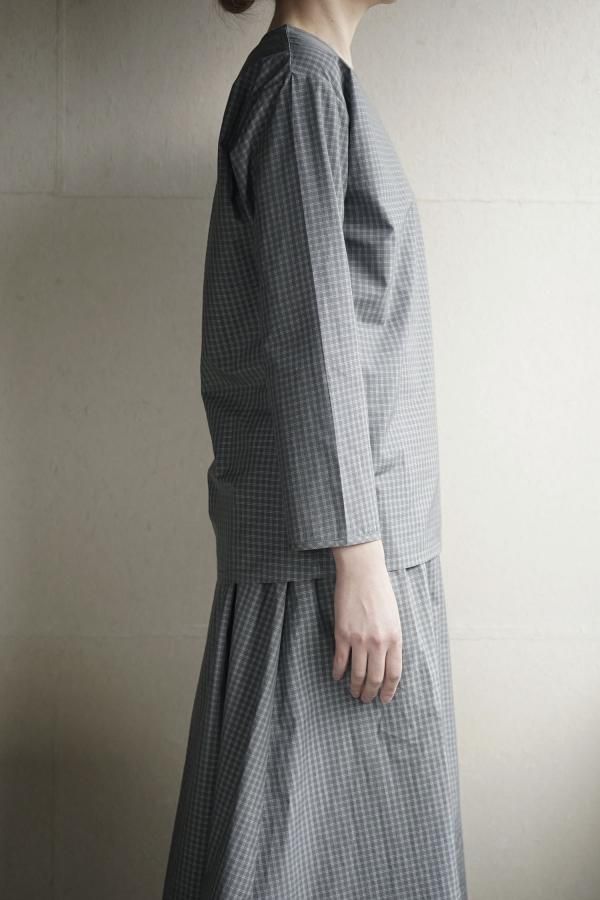 Charcoal×WhiteのYoliオリジナルパターンチェックを使ったブラウス。